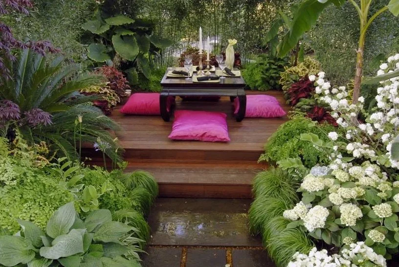 Award winning garden at the 2005 Cleveland Botanical Garden Flower Show. Bold, textural plantings create a shady, tropical enclosure. This meditative courtyard garden appeals to the senses: The sound of water, canvas canopies lifted by the wind, reflection of yellow recycled glass between the stone joints and the exotic texture of the bamboo. Created in collaboration with Ann Rosmarin.