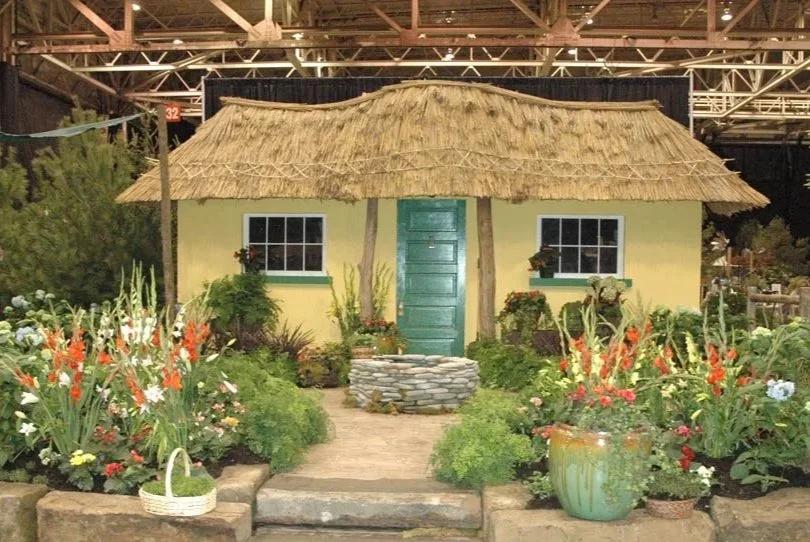 Award winning garden at the 2007 "Irish Theme” Cleveland Home and Garden Show at the IX Center. An authentic Irish cottage painstakingly recreated from an actual existing Irish cottage was the backdrop for the simple country garden. Actual Irish thatch, eucalyptus rods, reeds and replicated Irish signs are contained with in this garden. Created in conjunction with Turfworld Company.