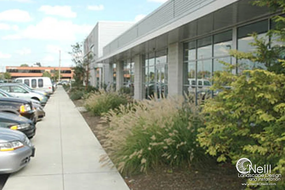 This organization qualified for the U.S. Green Building Council Leadership in Energy and Environmental Design (LEED) points. Sustainable landscape design strategies were incorporated, creating eligibility for federal funds. Goals included softening the hard edge, contemporary lines of the architecture, and incorporating mounding and ornamental grasses to symbolically and aesthetically reflect wheat fields. Created in collaboration with Ann Rosmarin.