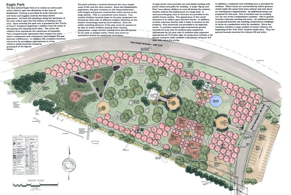 Eagle Park is a new park. Design components for this park included a water park, restrooms, play equipment, a shelter house, walking paths, sitting areas, and equal access for all individuals. The park has been well-received by the community, with construction complete. Foresight Engineering hired O’Neill Landscape Design to design this park.