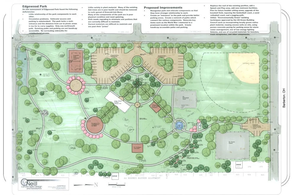 The Barberton Parks and Recreation Commission conducted a competition for the design of Edgewood Park. O’Neill Landscape Design was selected out of many submissions. Breitenstine and Tuscora Parks were included as well. Components include a spray park, shelter house renovation, restroom facilities, and playground equipment. The project was publicly bid, and construction was completed.
