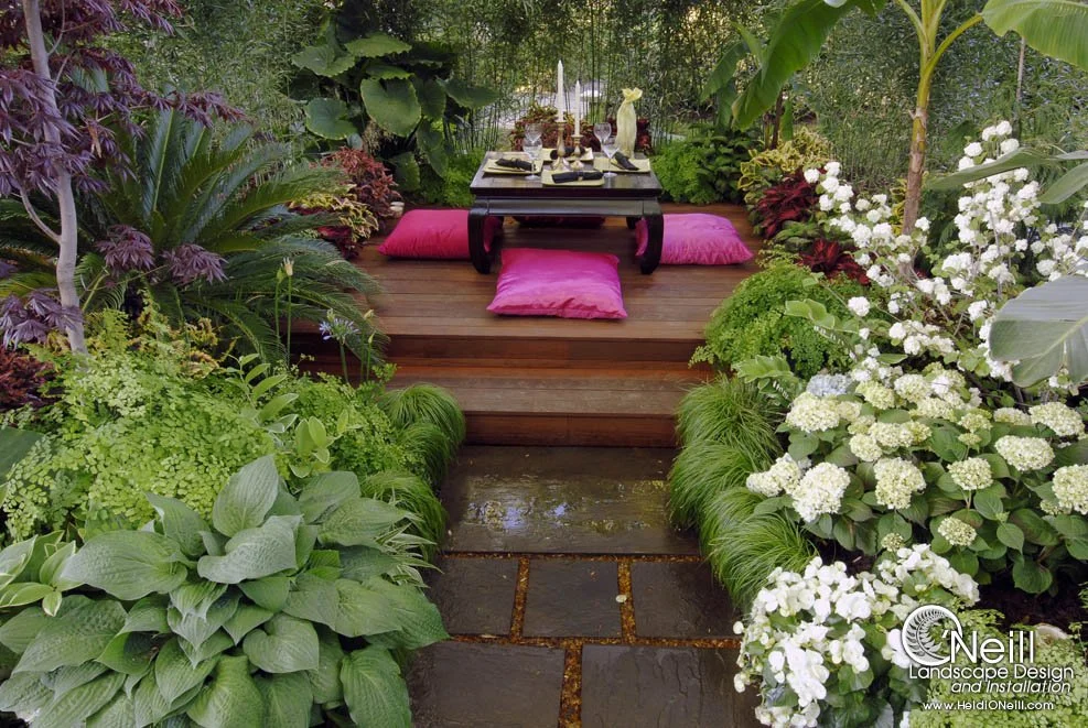 Award-winning garden at the 2005 Cleveland Botanical Garden Flower Show. Bold, textural plantings create a shady, tropical enclosure. This meditative courtyard garden appeals to the senses: The sound of water, canvas canopies lifted by the wind, the reflection of yellow recycled glass between the stone joints, and the exotic texture of the bamboo. Created in collaboration with Ann Rosmarin.